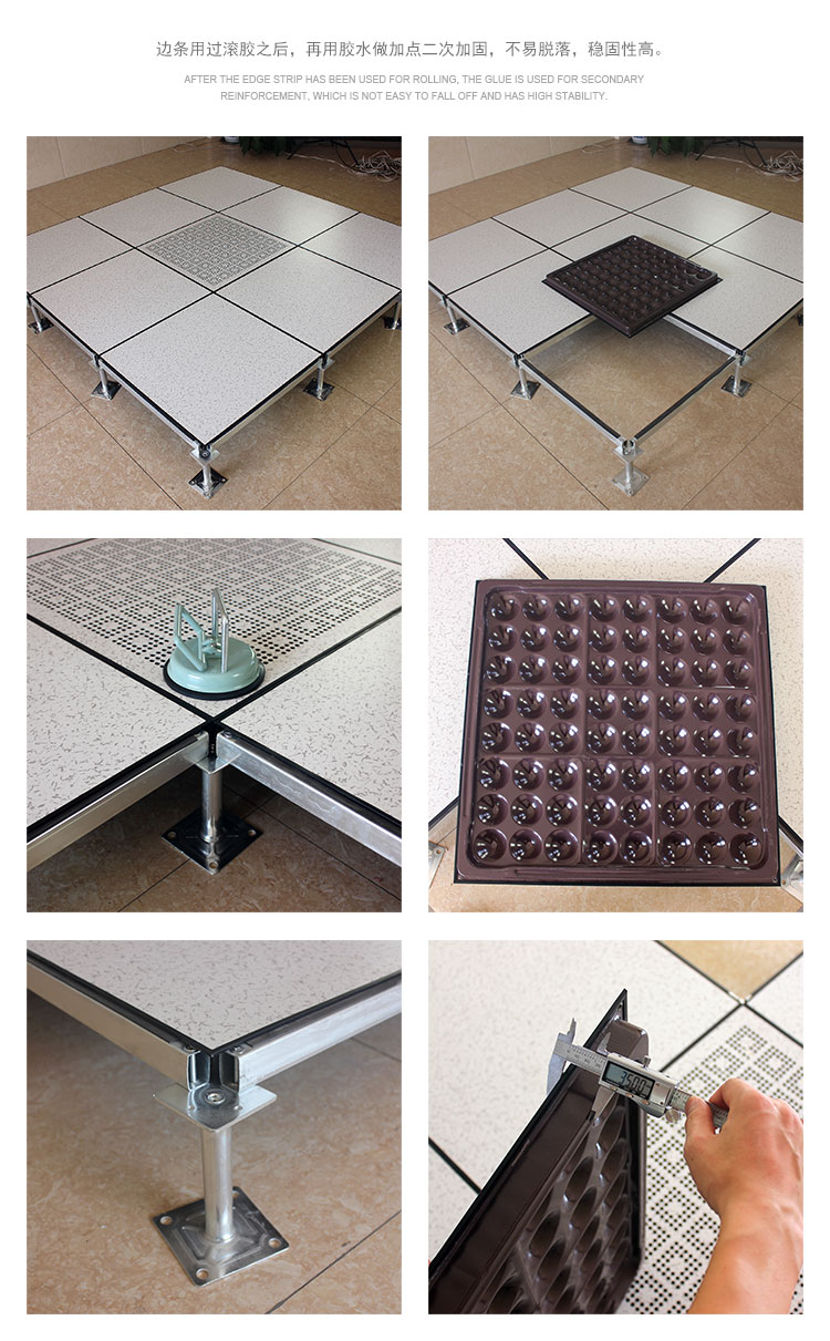 全鋼防靜電地板為全鋼組件,分有邊、無邊、微邊(三種邊處理方式)。底面采用SPCC深沖冷軋板拉伸成型鋼板厚度(0.4~1.5mm),球窩狀結構,增加地板的機械荷載強度。面板采用硬質SPCC鋼板(0.5~2.0mm),上下經過點焊焊接成型,切邊沖孔后,經防銹處理,環(huán)氧樹脂粉末靜電噴涂后,中間填充發(fā)泡水泥(可以根據(jù)客戶需求發(fā)泡不同重量),再經過日曬養(yǎng)護后形成穩(wěn)定的承載結構。地板上表層粘貼防火板(HPL)/復合PVC/ 通體PVC/陶瓷地磚等不同材質的裝飾表層,達到產品花色的多樣性、可以根據(jù)客戶需求個性化定制產品。搭配聯(lián)網(wǎng)支架、支架、螺釘組裝后,定位聯(lián)接更加準確、精度可靠。