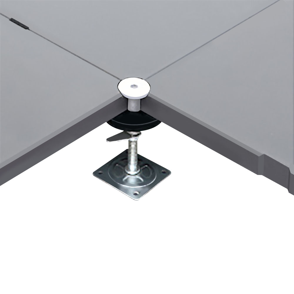 地板四角鍍鋅底座支承,不帶橫梁系統(tǒng)。每塊地板四角有90°圓弧,四塊板組合而成后形成一個(gè)圓,有一個(gè)鋁制螺母壓角固定。